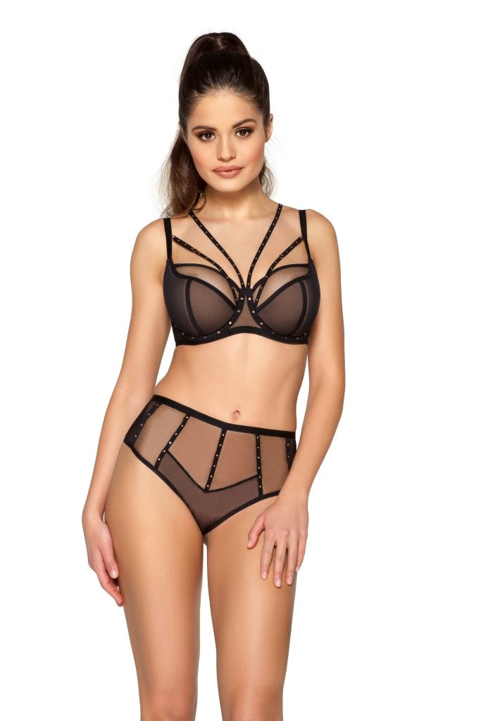 Бюстгальтер Pois Pois выполнен на косточках, чашки шитые, нижняя часть из тонкого поролона телесного цвета, верхняя часть чашки из черной сетки, внешняя сторона чашек из черной сетки, декорирована тонкими черными резинками, окантовка косточек с металлическими клепками. Бретельки бюста не отстёгиваются, регулируются по длине, в зоне декольте декоративные несъемные тонкие союзки с металлическими шариками и вторая пара тонких несъемных бретелей с металлическими шариками, регулируются по длине. На спине застёжка на удлинитель, количество крючков в ряду застёжки увеличивается пропорционально размеру бюстгальтера, спинка из плотной сетки. Фурнитура цвета розового золота.