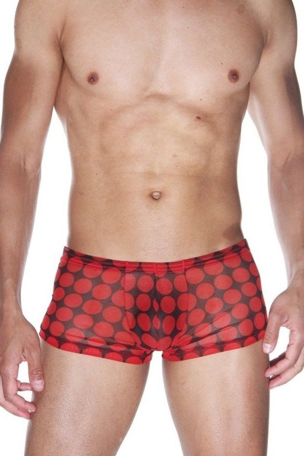 Простые, классической формы боксеры для мужчин, сшитые из полупрозрачной легкой ткани в крупный красный горох.