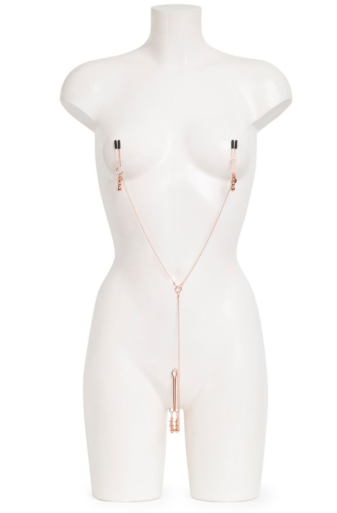 Зажимы для сосков и клитора. Металлические зажимы на соски с подвесками в виде цепочки из бусин. Степень сжатия сосков легко регулируется при помощи удобного механизма. Концы зажимов покрыты силиконовыми накладками для предотвращения повреждений сосков. Аксессуар обеспечит Вас новыми ощущениями и разнообразит сексуальную жизнь.Мини-уплотнительные кольца соединяют каждую цепь, открывая возможность дополнительного веса и удерживающих устройств.
