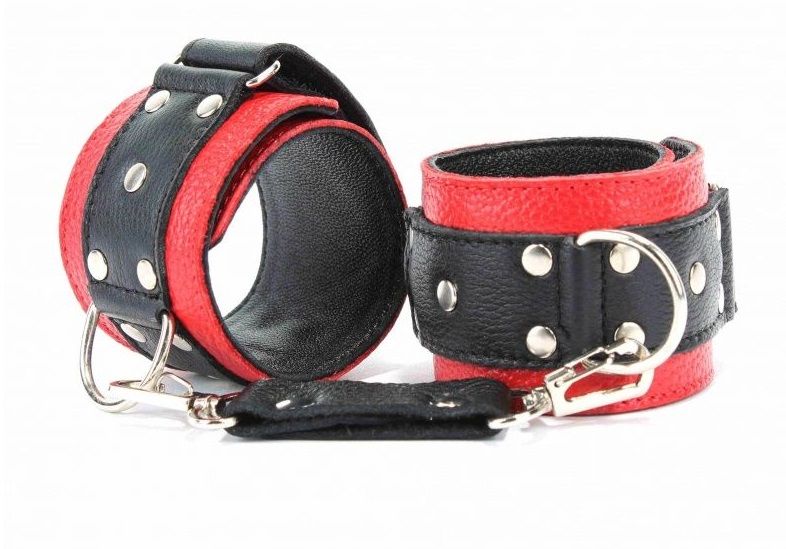 Кожаные наручники в красно-черной гамме. Украшены заклепками и соединяются между собой цепью с карабинами. Размер наручников регулируется при помощи застежки-липучки. Ширина - 5 см. Длина цепочки - 15,5 см.