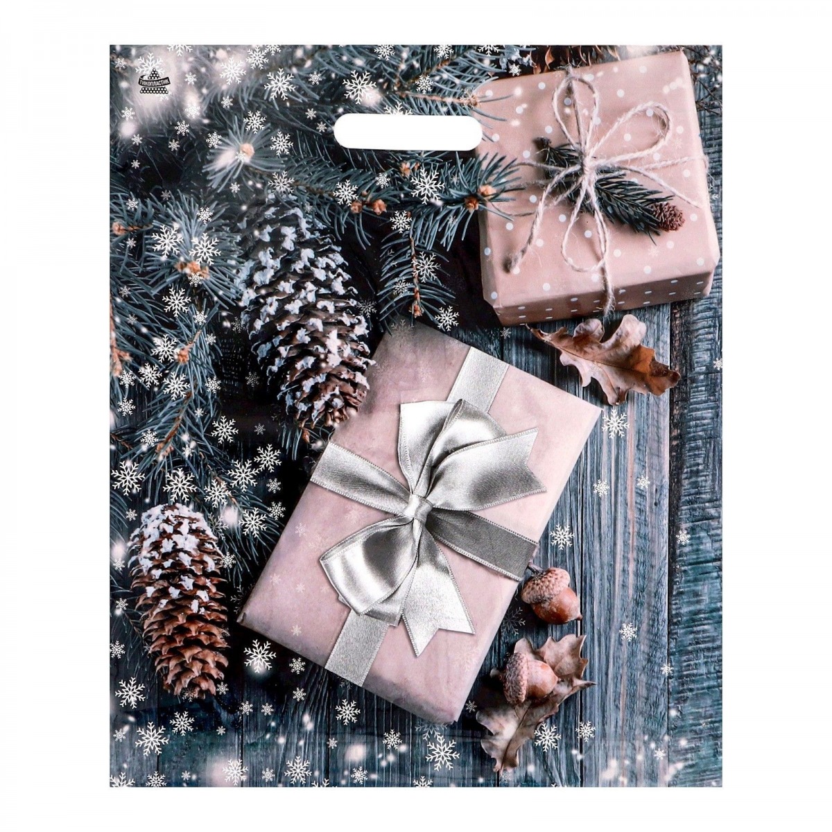 Новогодний пакет с принтом в виде подарков и вырубной ручкой (45х38 см).
