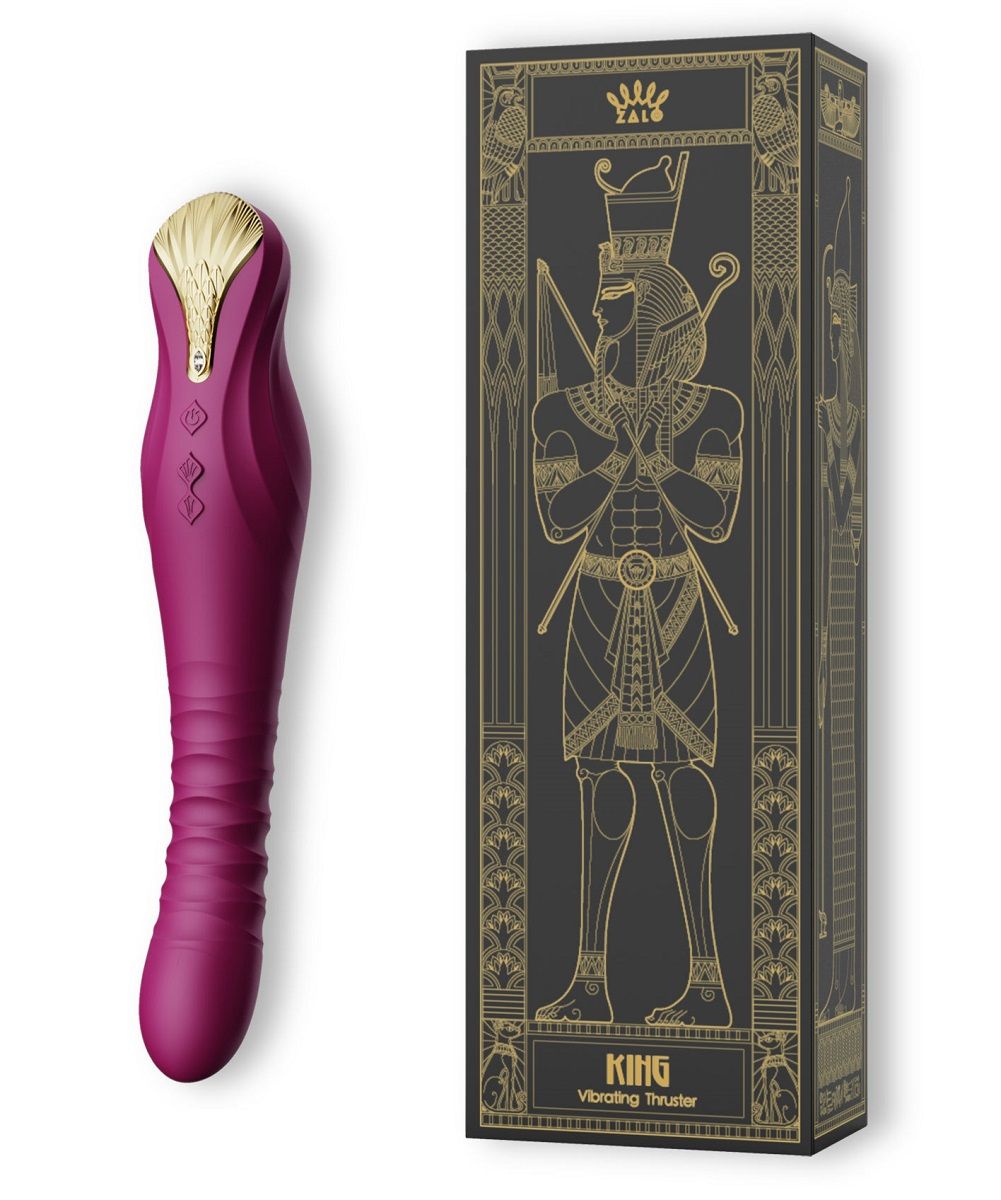 Дизайн King вдохновлен золотой маской древнеегипетского царя, символизирующей завоевания, силу и непреодолимую магию. Дизайн золотого украшения в верхней части несет в себе мистический антураж с использованием символов: орла и кобры. Мы объединяем эти два элемента, перья орла и чешую кобры, в форму лотоса, который не только имеет красивый внешний вид, но и несет в себе всю долгую и насыщенную историю Древнего Египта. King применяет передовую технологию PowerThrust, органично интегрируя высокопроизводительные системы моторчиков и инновационные конструкции электроприводов, преодолевая ограничения традиционных аналогов и поднимая тяговую мощность моторчиков на новый, недосягаемый уровень, что доставит вам более мощный оргазм. Вибратор осуществляет мощные толчки до 1,5 см длиной. Особенности: -Безопасный для тела силикон премиум-класса -Украшен настоящим кристаллом SWAROVSKI -4 режима вибрации 8 режимов мощности -Класс водонепроницаемости: IPX4 - защита от брызг воды -Управление через приложение ZALO REMOTE. Рабочая длина - 15,2 см. Время зарядки - 2 часа. Время работы - до 3 часов.